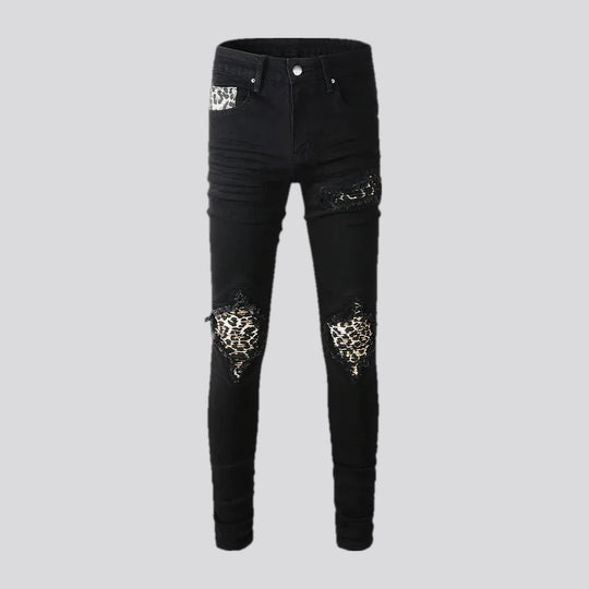 Mid rise biker style leopard moto men's jeans